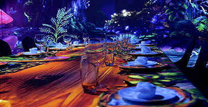 沉浸式餐廳是通過多個投影設備對各種長度形狀的幕墻進行投影照射,將素材視頻,通過晟跡大屏融合技術,準確的展現(xiàn)在各種幕墻,地板,餐桌,甚至天花,從而營造出全方位,多層次且相互銜接的影像。