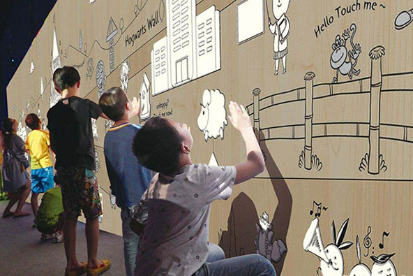 霍格沃茲墻的正前方安裝了兩個高清投影機,背景板的正上方是互動雷達感應器。當你用手指輕輕觸碰投影墻上的圖形,原本靜止的圖形就會瞬間立體般地運動起來,屏幕上出現了神奇的動畫影像,發光發亮并且傳出優美的聲音。